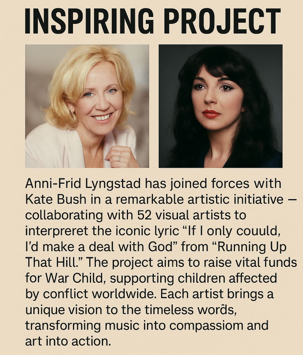 LONDON, ENGLAND — In a stunning act of creative compassion, Anni-Frid Lyngstad of ABBA and Kate Bush, one of Britain’s most enigmatic and visionary artists, have come together for a groundbreaking artistic project that merges music, memory, and mercy. The initiative brings together 52 visual artists from around the world, each tasked with reimagining a single, timeless lyric from Bush’s iconic 1985 hit “Running Up That Hill” — the haunting line, “If I only could, I’d make a deal with God.”